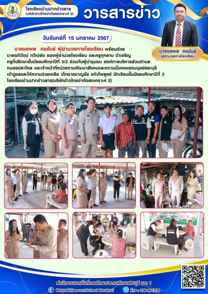 นายชยพล คชขันธ์ ผู้อำนวยการโรงเรียน พร้อมด้วย นายอภิวัตน์ ทวีเปล่ง รองผู้อำนวยโรงเรียน และครูกุหลาบ น้าเจริญ ครูที่ปรึกษาชั้นมัธยมศึกษาปีที่ 3/2 ร่วมกับผู้นำชุมชน องค์การบริหารส่วนตำบลหนองปลาไหล และเจ้าหน้าที่หน่วยงานพัฒนาสังคมและความมั่นคงของมนุษย์สระบุรี เข้าดูแลและให้ความช่วยเหลือ เด็กชายชาญชัย แก้วไพฑูรย์ นักเรียนชั้นมัธยมศึกษาปีที่ 3 โรงเรียนบ้านปากข้าวสาร(บริษัทข้าวไทยจำกัดสงเคราะห์ 2)