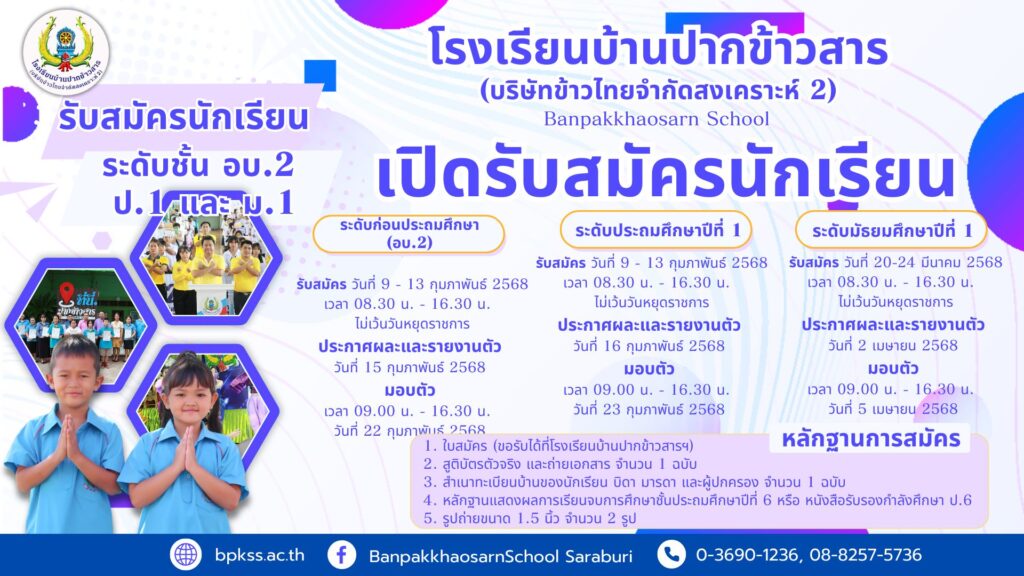 สามารถติดต่อสมัครเรียนและขอรับใบสมัครได้ที่โรงเรียนบ้านปากข้าวสาร(บริษัทข้าวไทยจำกัดสงเคราะห์ 2) โทร 036-901236,088-2575736